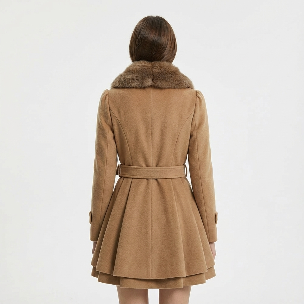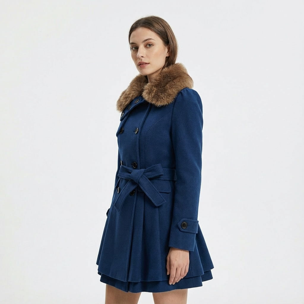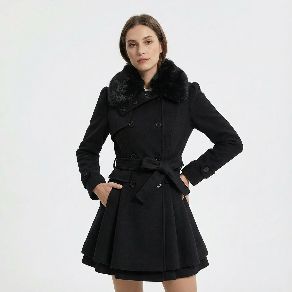Een lange wintermantel met ceintuur en bontkraag die warmte en elegantie combineert. De zachte wolmix, uitlopende snit en dubbelrijige sluiting creëren een vrouwelijke, verfijnde look voor koude dagen in de stad.