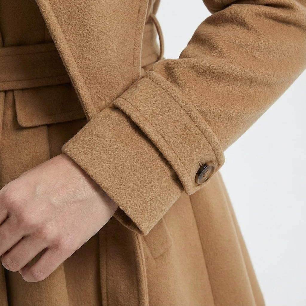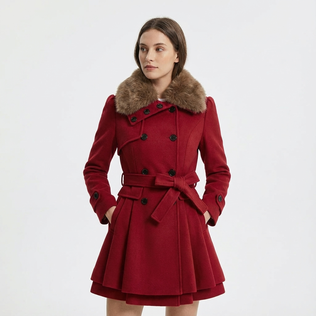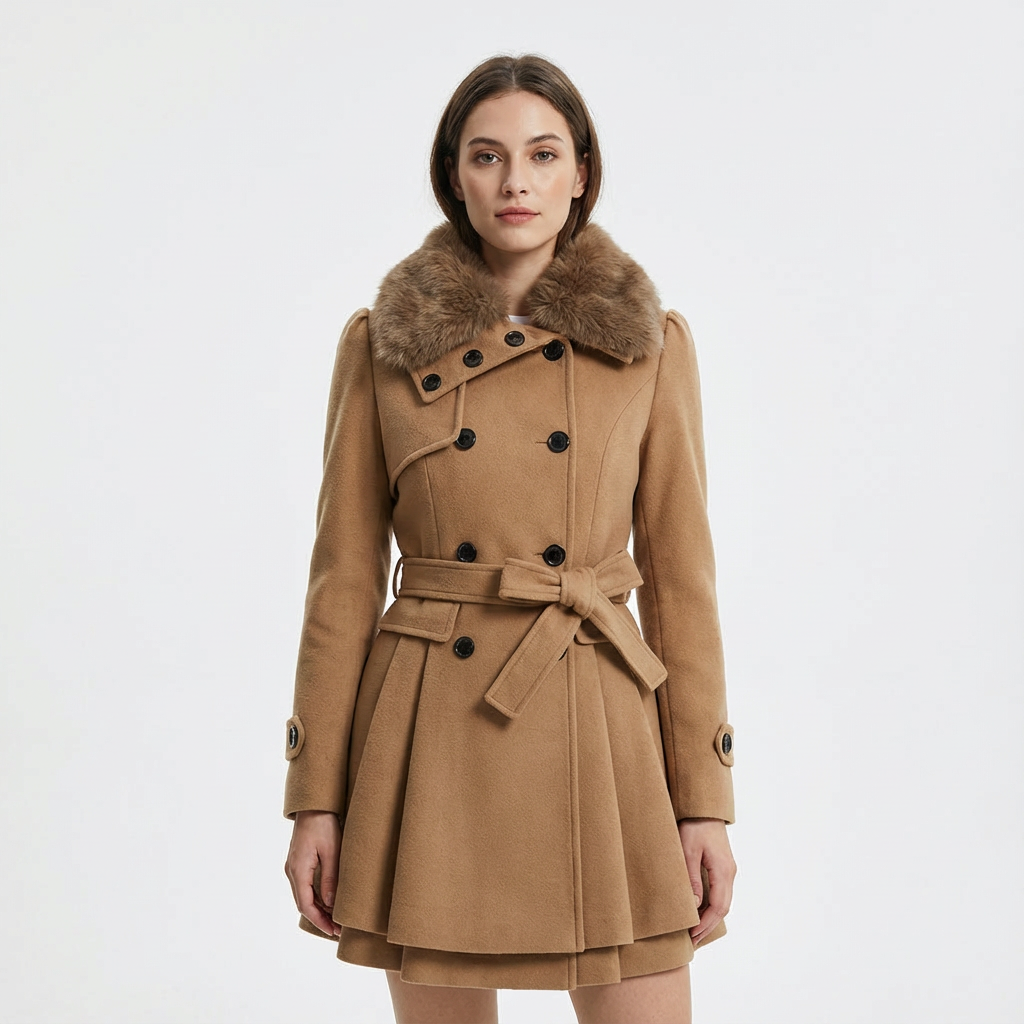 Een lange wintermantel met ceintuur en bontkraag die warmte en elegantie combineert. De zachte wolmix, uitlopende snit en dubbelrijige sluiting creëren een vrouwelijke, verfijnde look voor koude dagen in de stad.
